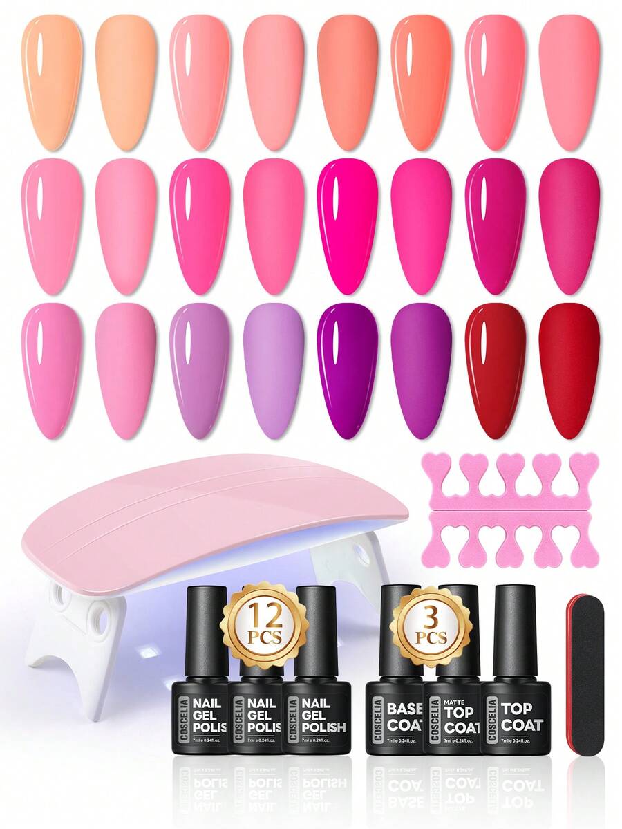 coscelia 18PCS Pink Nail Gel Polish With UV Lamp-Nude Red Orange Gel Nail Polish & Top Base Coat, Semi-Permanent Nail Supplies For Women Home Salon Christmas Gift