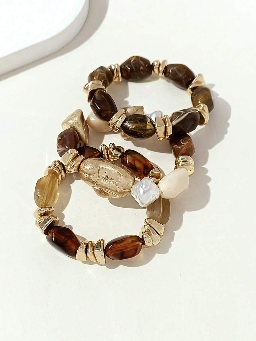 LADYCOCO 3pcs Vintage Multi-Layer Brown Acrylic Beaded Bracelet, Transformable Gold Chip Bracelet, For Women, Couples, Party, Daily Wear