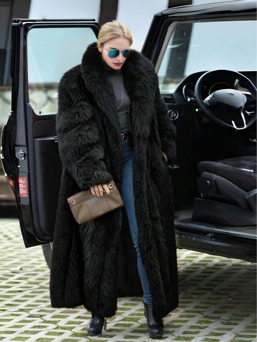 Chic Women's Black Faux Fur Coat Loose Fit Long Length Regular Long Sleeve Fuzzy Detail Waterfall Neckline