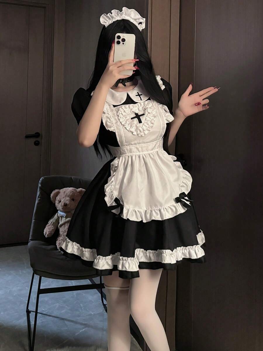 Cute Lolita Maid Costume With Ruffle Hem Flared Ball Gown And Puff Sleeves Round Neck Contrast Lace Design Perfect For Party