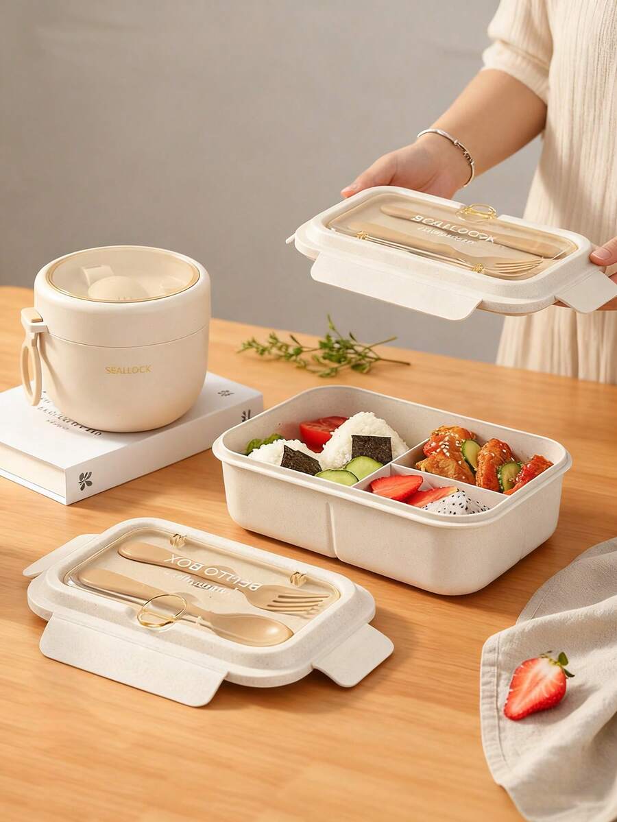 Lunch Box Set, School Lunch Box With Fork And Spoon, Breakfast Cup, Salad Cup, Lunch Box Bag, Lunch Bag, Wheat Straw Lunch Box Set, Portable Breakfast Box Lunch Box For Home, School, Office, Travel And Outdoor Picnic