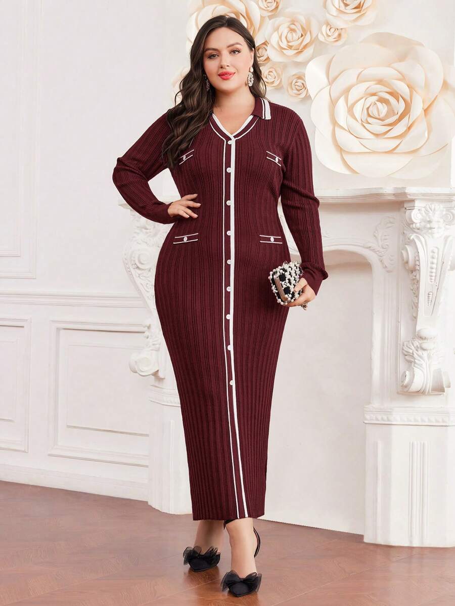 SHEIN Modely Plus Size Color Block Knitted Sweater Dress With Contrast Trim