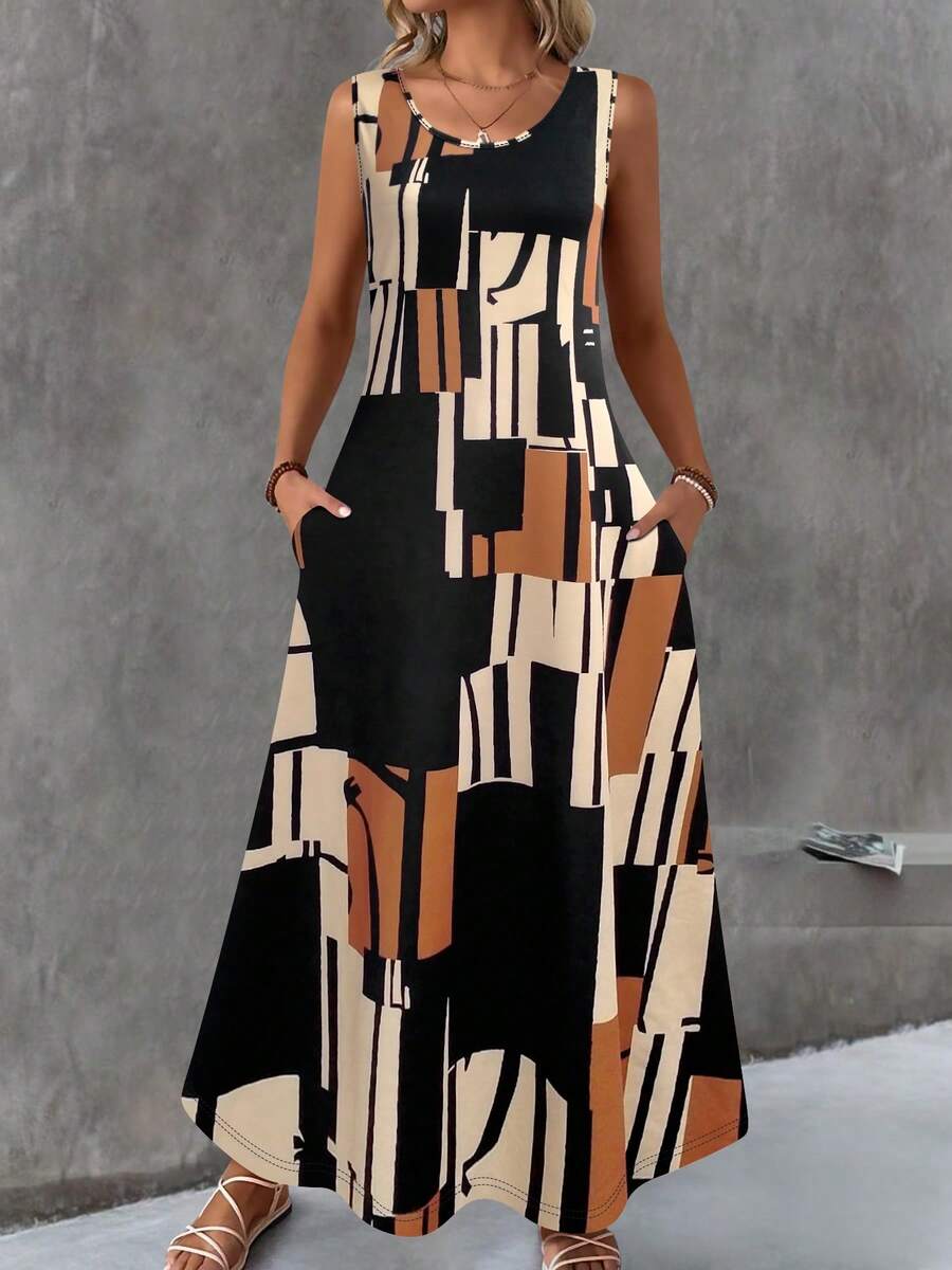 Plus Size Pocket All Over Print Summer Dress Vacation Casual Daily Wear Spring Summer Outfits Sleeveless Geometric Print Long Dress