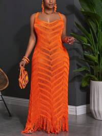 SHEIN SXY CURVESHEIN SXY Plus Size Women Spring/Summer New V-Neck Sleeveless Hollow Out Tassel Bodycon Mini Knit Dress, Suitable For Everyday Wear, Music Festival, Concert, Carnival Party, Beach Vacation, Date Night, Birthday, Bachelorette Party Outfit, Club, Cute, Casual, Shopping, Streetwear, Going Out, Coquette, Easy To Match & Looks Slim, Accentuates The Body, Flattering Silhouette Red Feather Trim Dress Red Crochet Dress Red Mini Dress Red Sleeveless Dress; Red Fringe Dress Winter Fall Autumn #7 Bestseller