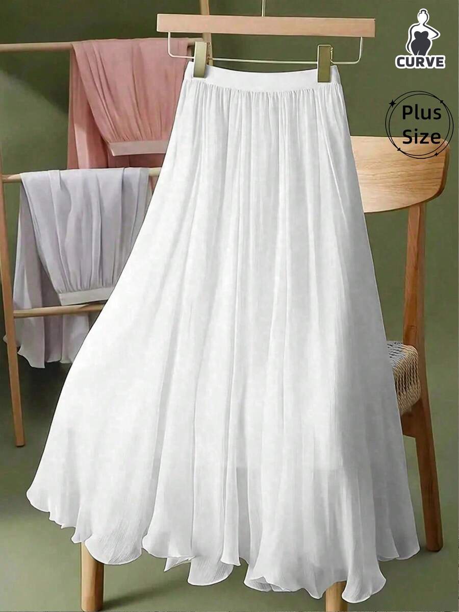 Plus Size Women's Spring/Summer Skirt, Women Elastic Waist Casual Solid Color Mid-Length Chiffon A-Line Skirt, With Lining, Elegant Fitted Slimming, Suitable For Spring/Summer Casual, Work, Vacation Wear