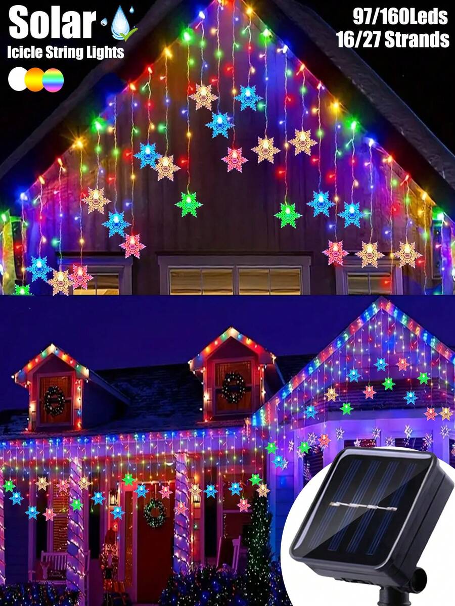 Solar Snowflake Icicle String Lights, 97/160 LED 16/27 Strands Christmas Lights For Indoor/Outdoor, IP65 Waterproof With 8 Modes Eave Lights, Suitable For Christmas, House, Garden, Trees, Yard, Stairs, Roof,Festival ,Party Decorations (Warm White/Multicolor/White)