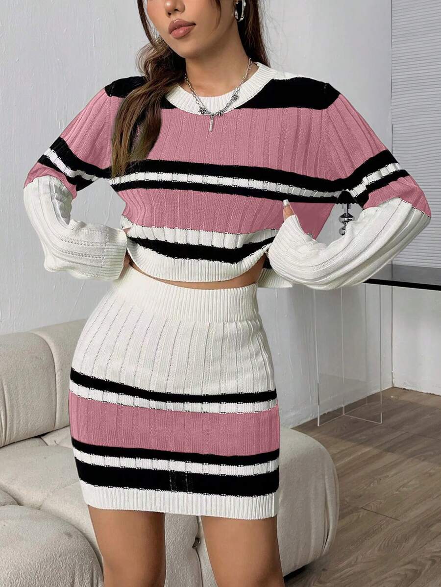 Ensemble De 2 Pièces Pour Femmes - Pull À Manches Longues À Rayures Et Jupe Mi-longue En Tricot