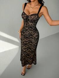 SHEIN BAE Summer Women Lace Patchwork Spaghetti Strap Dress, Suitable For Graduation Party, Wedding Guest Dress, Date, Banquet, Party, Sisterhood Gathering,Wedding Guest Dress Women,Red Dress,Valentine's Day,Valentine Outfits For Women #1 Bestseller