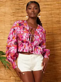 Slaydiva Plus Solid Tie Front Button Front Crop Blouse