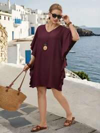 SOLERSUNSOLERSUN Plus Size Women's Early Spring And Summer Fashion, Elegant Vacation, Casual Short Sleeves, Raglan Sleeves, Bat Sleeves, Round Neck Shirt, Cinched Waist Strap, Front Pleated Blue Texture Woven Fabric, Daily Matching, Shopping, Dating, Spring Vacation, Valentine's Day,Fashionable Commute #2 Bestseller