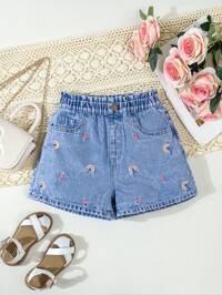Sparklyn Preteen Girls' New Rainbow Heart Embroidery Ruched Waist Stylish Slim Fit Denim Shorts, Summer Summer Holiday