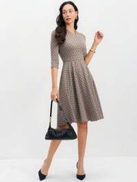 EMERY ROSE Dresses For Women Elegant V-Neck 3/4 Sleeve Geometric Knitting Intarsia Jacquard Elegant Commuter Dress