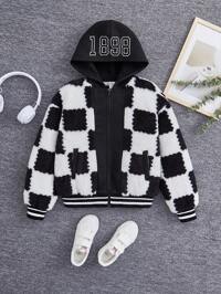 Tween Girl Checker Pattern Striped Trim Hooded Fleece Jacket