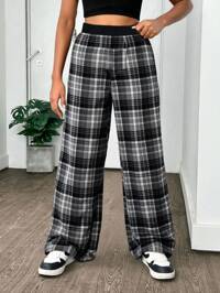 SHEIN Tween Girl Street Chic Woven Checked Straight Leg Pants
