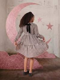 SUMWON Tween Long Sleeve Puff Sleeve Checked Tiered Mini Dress With Empire Waist And Bow Tie Back Detail For Casual Occasions Vacation