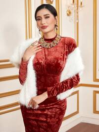 Al Najma Mock Neck Embroidery Detail Fuzzy Cuff Trumpet Sleeve Kaftan, Modest Long Sleeve Arabian Dress