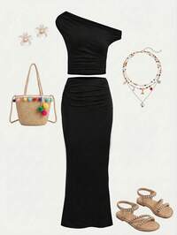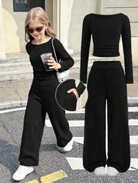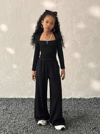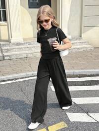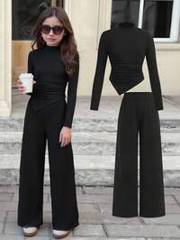SparklynSHEIN Tween Girl Casual Basic Minimalist Comfortable High-Stretch Fleece Stand Collar Asymmetric Ruched Fitted Top And Relaxed Wide Leg Pants 2 Pieces Set, Back To School, Black, Suitable For Daily Outings, Two Piece Pants Set,Suitable For Winter, Casual, Preppy, Cute & Casual & Vintage, Great For Autumn/Winter Casual, Daily Wear, School