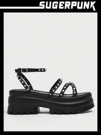 Sugerpunk Woman Shoes Spiked Decor Criss Cross Sandals, Punk Black Ankle Strap Flatform Sandals For Summer Vacation Shoes Summer Y2k Punk Cool Street Sporty Halloween Spring Shoes Spring Break Easter