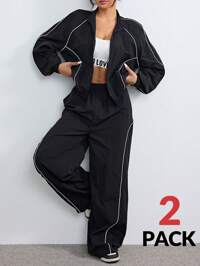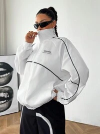 SHEIN EZwear Women's Casual Letter Print Zip-Up Jacket, Autumn