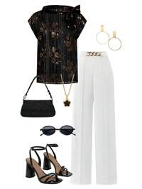 SHEIN Clasi Elegant Women's Short Sleeved Gold Embossed Chiffon Ribbon Tied Shirt, Suitable For Various Occasions