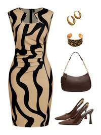 Ellevyn Women Asymmetrical Neck Waist Ruched Pencil Dress, Body-Sculpting, Sleeveless, Ripple Strip Khaki & Black Short A-Line Dress Business Casual Woman