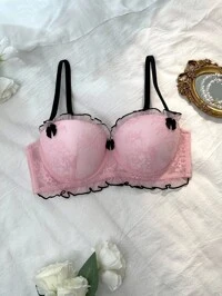 DelicateAllure1pc Pink & White Push-Up Balconette Underwired Molded 1/2 Cup Strapless Floral Lace Bra, Suitable For Vacation, Party, Plus Size, Wireless Lingerie Bra, Intimate, Party, Date, Innocent, Sexy, Cute, Kawaii, Lift